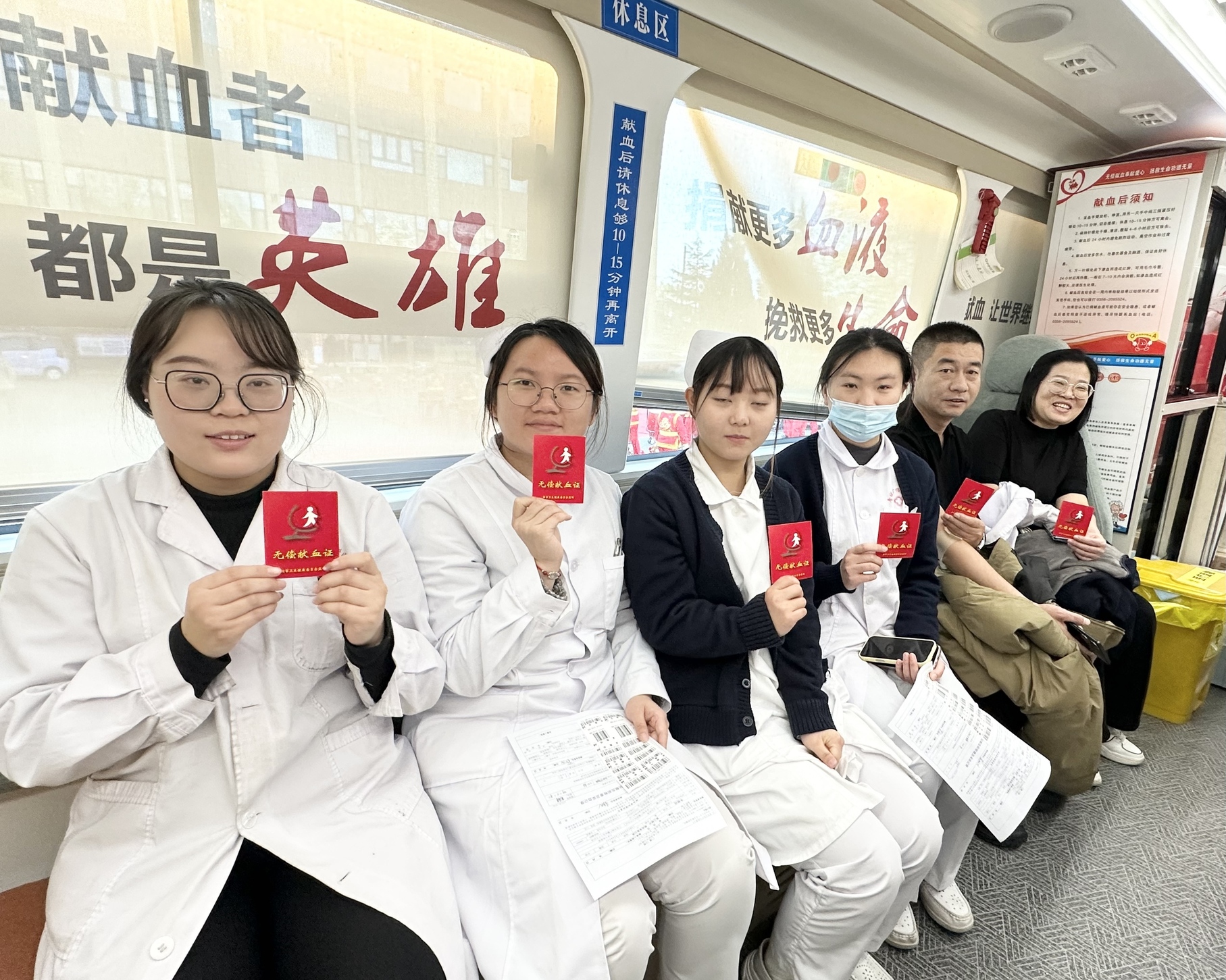 献血车上,妇产科护士长张潇潇和中医科护士长李娟不约而同地前来献血。她们一边互相鼓励,一边交流着献血的感受。