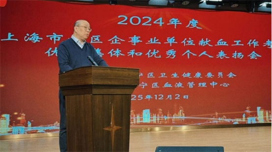 首先致辞,他向所有获奖者表示热烈祝贺,并衷心感谢各社区、企事业单位对无偿献血事业的长期坚守与大力支持。他在讲话中指出,要始终坚持高站位谋划,进一步强化宣传引导,积极营造全社会关心、参与无偿献血的良好风尚,全力推动区域献血工作迈向更高质量,为保障人民群众生命健康、助力“健康长宁”建设贡献坚实力量。