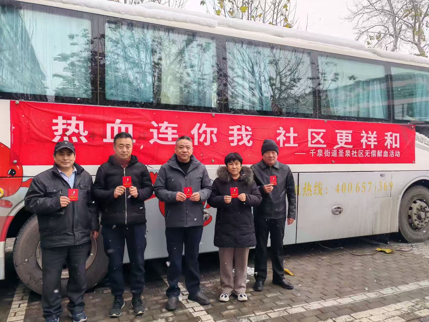 大街上还有陆续赶来的人们,尽管雪花肆意飞舞,气温低至零下三摄氏度,但献血现场却是一片热火朝天的景象。他们中既有来自各行各业的普通职工,也有闻讯而来的社区居民。大家有序地登记、体检、献血,每一个环节都进行得有条不紊,这些普通的街道社区居民用自身行动,展现了当代中国人的凝聚力和无私大爱。大家成功献血后,手举着献血证,脸上都洋溢着自豪的神情!