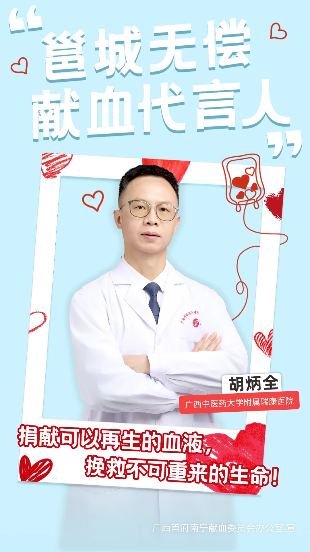 “作为医生,我既是血液的使用者,也是血液的捐献者。这种双重身份让我的话语更有说服力。”2024年,胡炳全自愿为邕城无偿献血代言,将热血情怀融入工作和生活的方方面面:在生活中,他积极呼吁家人、亲戚朋友参与无偿献血,用亲身经历消除周围人对献血的顾虑。在工作中,他利用与患者家属沟通的机会,耐心宣传无偿献血知识,让更多人理解献血的安全性和重要性。