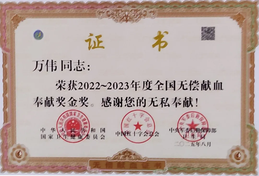 青春热血,爱如宝石。8月20日,国家卫生健康委等部门发布《关于表彰2022-2023年度全国无偿献血表彰奖励获奖者的决定》,咸阳宝石钢管钢绳有限公司零零后职工万伟榜上有名,荣获了全国无偿献血奉献奖金奖。