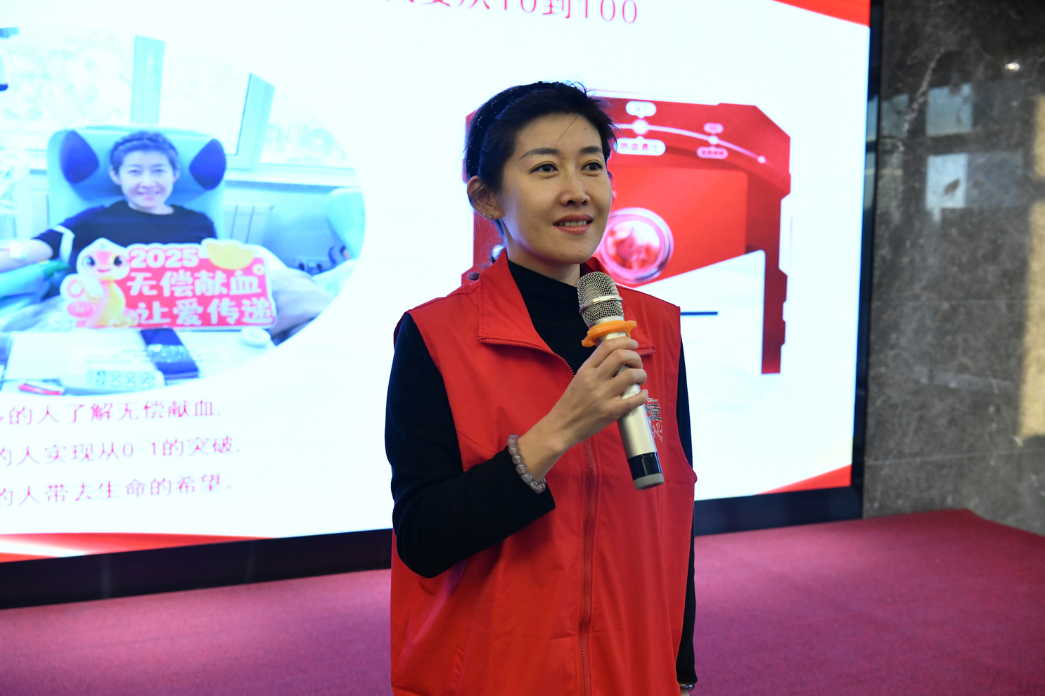 在典型事迹分享环节,一个个感人至深的故事传递着公益路上的坚守与温情。郭希龙以《献血书写大爱,服务矢志不移》为题,深情讲述了献血达人谭锡博队长的公益历程 --累计献血总量达15万多毫升,创下连续69个月每月捐献2个治疗量血小板的纪录,即便丈夫突发重病仍坚守志愿服务岗位,用行动诠释“一切献给党”的赤诚。