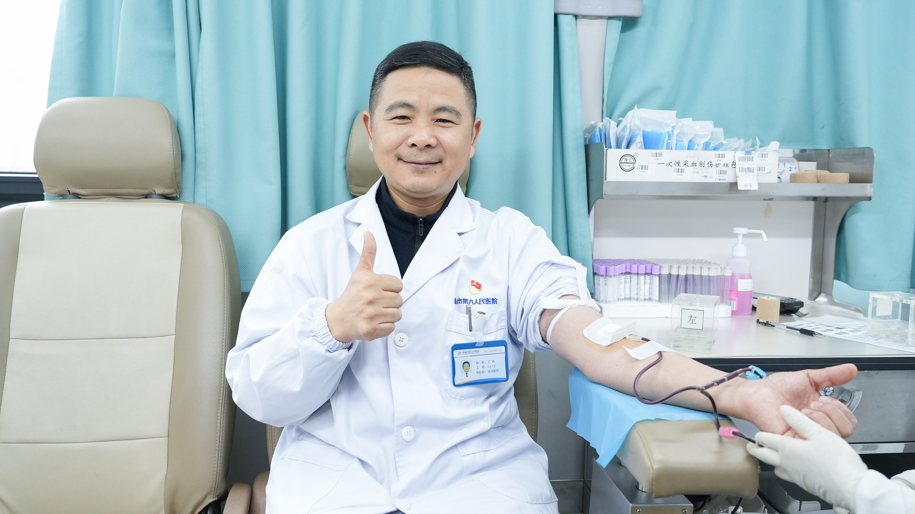 “平时做手术全靠血液托底,今天换我们来当‘供血侠’,这波双向奔赴必须到位!”六院党委委员、党政办主任丁祎已经献血18次,累计献血6900mL。他还贴心分享献血小贴士:“献血后吃点含铁、蛋白质的食物,注意补充水分,第二天就能活力满满上班~大家放心冲,一起为生命加油!”