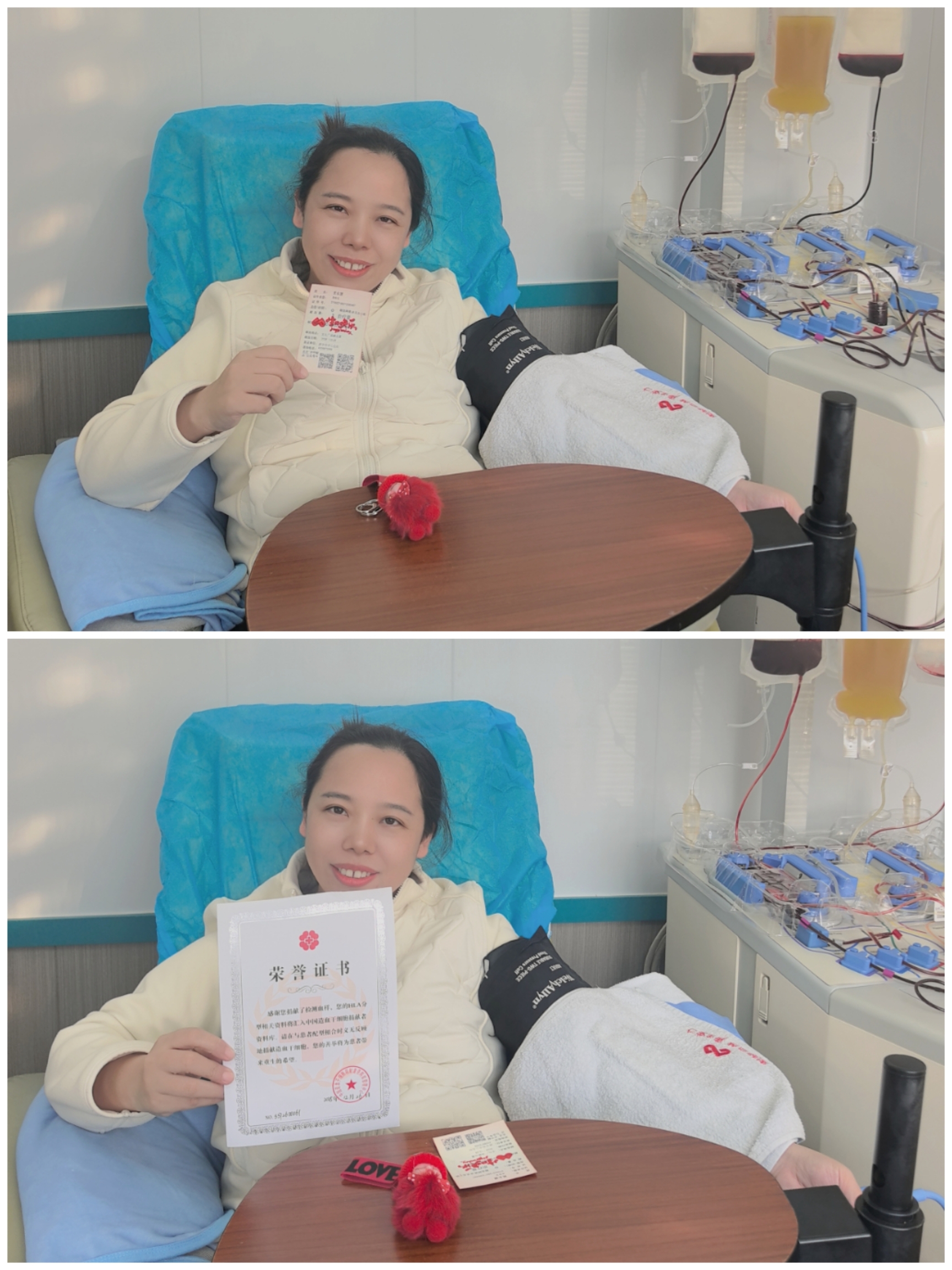 樊东慧不仅自身践行公益,还积极动员身边亲友加入爱心队伍,成功带动自己的丈夫参与到成分血捐献中,让涓涓热血汇聚成滋养生命的磅礴暖流。尤为令人动容的是,樊东慧完成成分血捐献后,还主动进行中华骨髓库留样登记,自愿成为一名造血干细胞捐献志愿者,为深陷病痛的血液病患者点燃生命的新希望。在这个特殊的生日里,她收获了两份承载着特殊意义的荣誉证书——一份是中国造血干细胞捐献者资料库颁发的入库荣誉证书,另一份是印刻着“生日快乐”暖心字样的献血证,这两份证书,正是对她爱心善举最珍贵的见证。