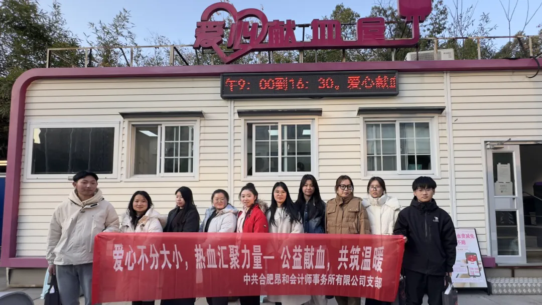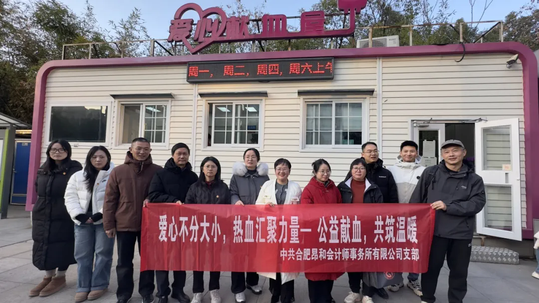2025年12月25日下午,合肥昂和会计师事务所有限公司和合肥昂和资产评估有限公司在安徽省立医院南区献血屋组织开展了以"青春献热血,爱心铸担当"为主题的无偿献血活动,企业员工积极响应号召,以青春热血践行社会责任。
