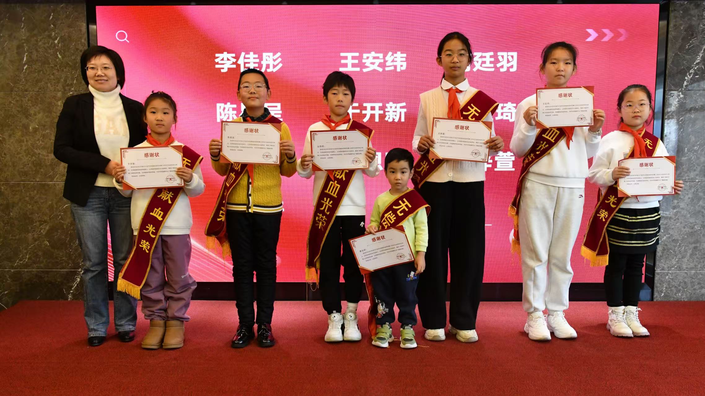 市红十字会赈济救护部副部长尹少芳为于开新、王安纬等小宣传员颁发感谢状,感谢他们用纯真的笑容传递爱心,以年轻的肩膀担当公益责任。