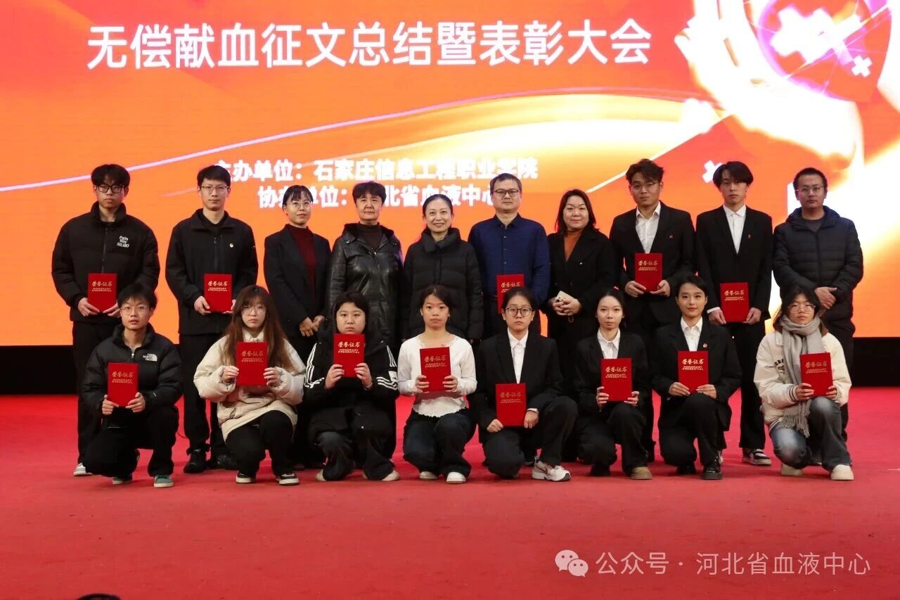 笔墨抒怀,丹心筑爱。12月24日,“青春献热血 笔墨传爱心——无偿献血征文总结暨表彰大会”在石家庄信息工程职业学院昭德礼堂举办。本次活动由石家庄信息工程职业学院主办,河北省血液中心协办,学院学生处、省血液中心业务科等相关负责同志及学校志愿者代表等300余人参加活动。