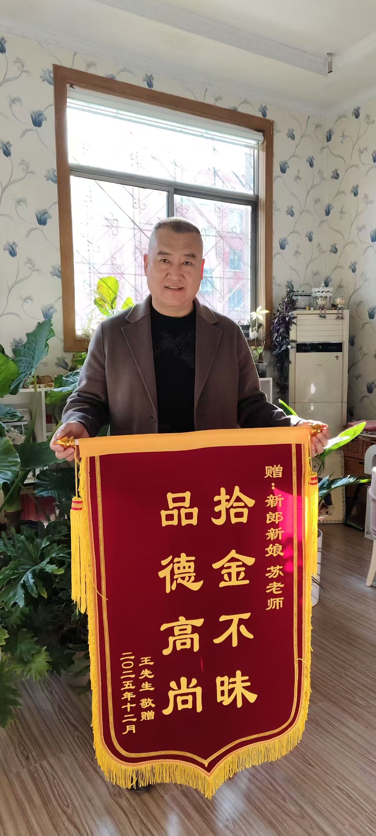 为了表达对苏成建的深深感激之情,王赞精心定制了一面写有“拾金不昧,品德高尚”的锦旗。第二天,他怀着无比崇敬和感激的心情,亲手将锦旗送到了苏成建的手中。