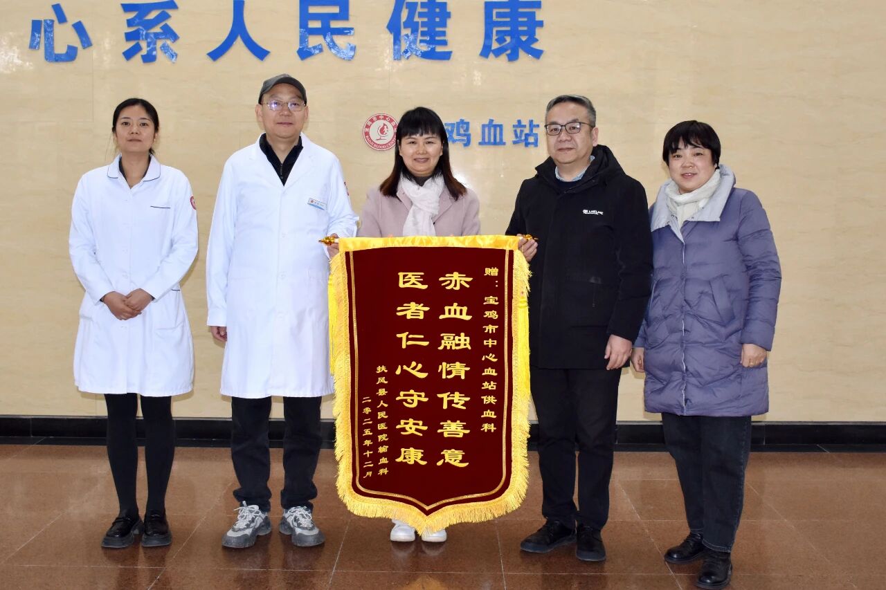 12月22日上午,宝鸡市扶风县人民医院有关人员专程来到宝鸡市中心血站,将一面写有“赤血融情传善意,医者仁心守安康”的锦旗交到血站相关负责人手中,对血站在扶风县近期几起紧急用血时给予的全力支持和保障表示衷心感谢。