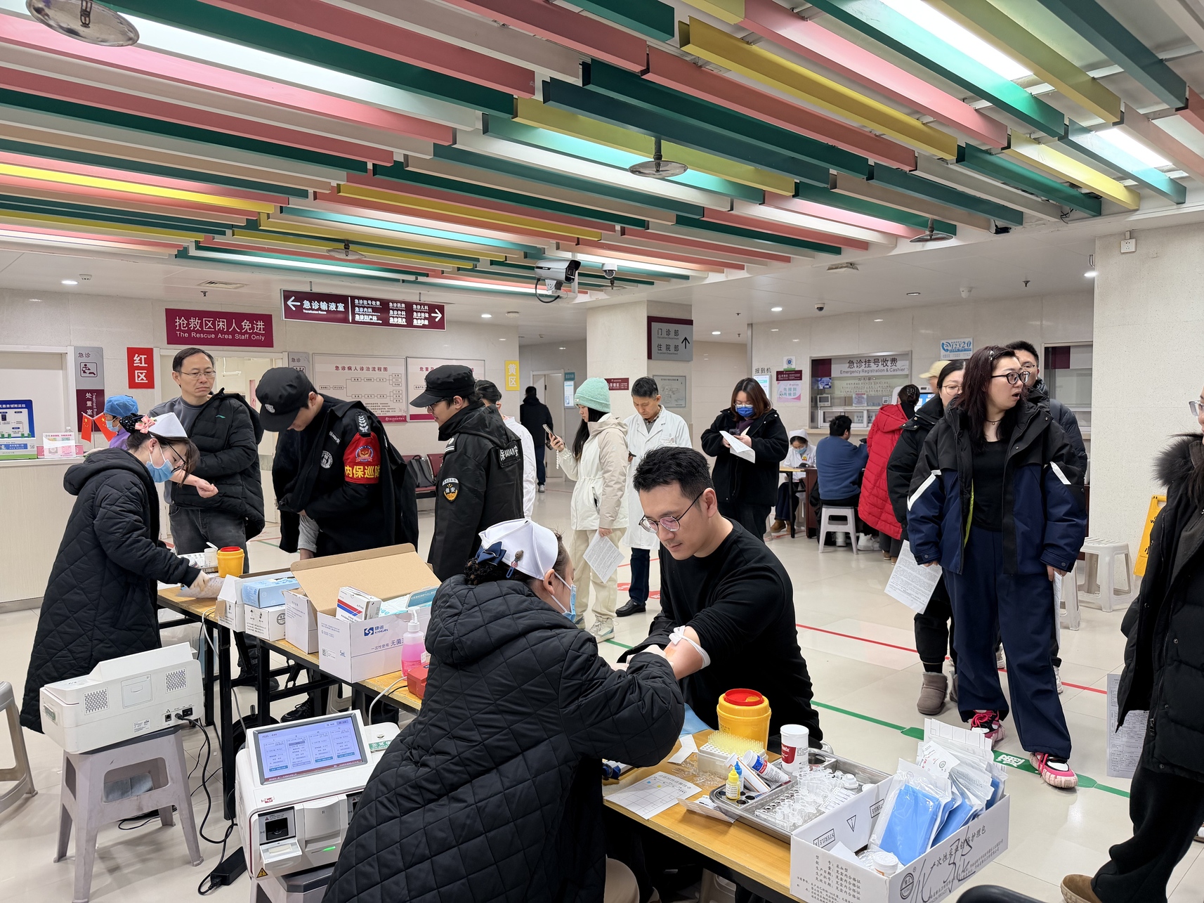 活动当天医院急诊大厅内人头攒动,有刚刚结束夜班却依然精神抖擞的医护人员,也有行政、后勤岗位上默默奉献的工作人员。他们中不乏有经验丰富的资深献血达人,也有朝气蓬勃的初次献血者。大家满怀对生命的敬畏和对社会的责任感,毫不犹豫地伸出手臂,让带头体温的血液缓缓流入血袋。
