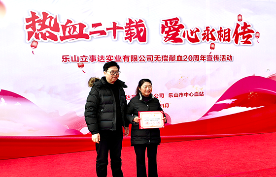 1月14日,在这个充满温情的日子里,乐山立事达实业有限公司无偿献血20周年“热血二十载、爱心永相传”无偿献血爱心公益活动在公司音乐广场隆重举行。自2005年起,乐山立事达实业有限公司连续20年组织员工参与无偿献血活动,累计献血2千余人次,约60多万毫升。