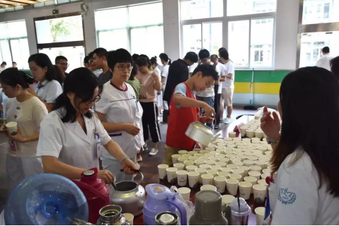 预防保健科特别准备了糖水和盐水,志愿者们身穿红T恤正在进行导引,一切井然有序。
