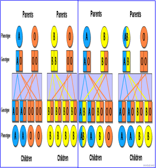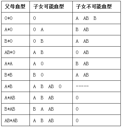 我们知道,ABO血型的遗传遵循孟德尔遗传规律,通过父母的ABO血型可以大致推测子代的血型(如下图)。