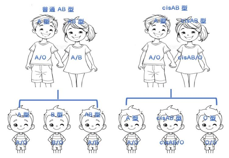 AB血型的A基因和B基因分别位于两条不同的染色体上,向子代遗传时,只能随机将其中一个等位基因遗传给子代。一般情况下,AB型的母亲和A型的父亲,其子女的基因组合只可能是AA、AO、BO或AB,其血型可能是A型、B型或AB型,因此,一般认为AB型的母亲和A型的父亲不可能生出O型的孩子。然而,在医学上却有这样的例外,这就需要我们正确认识一种特殊的血型--cisAB血型。