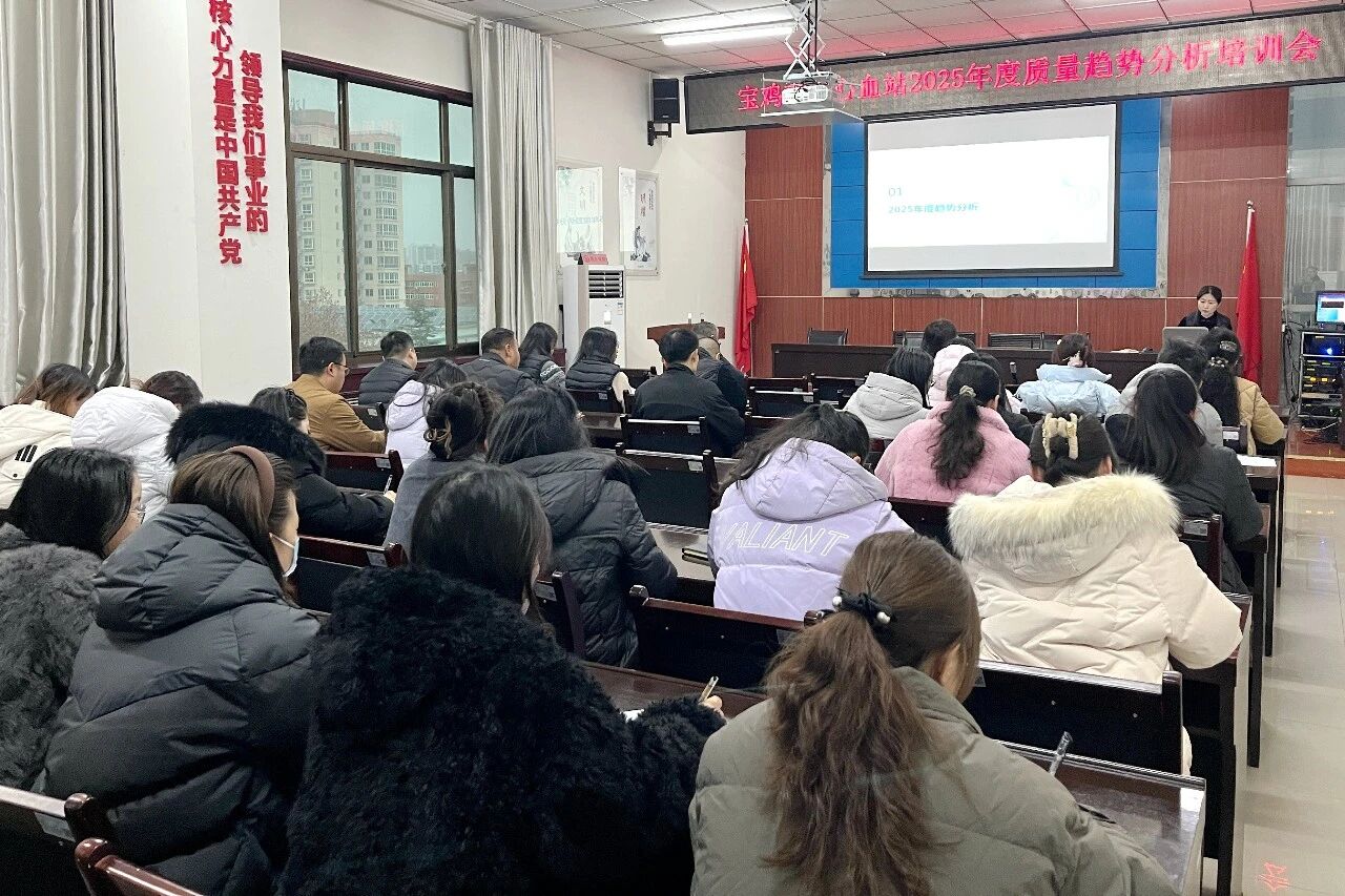为持续强化全员质量安全意识,提升采供血质量管理科学化、精细化水平,宝鸡市中心血站于1月19日上午组织召开了2025年度质量趋势分析暨专项培训会。全站干部职工参加会议。