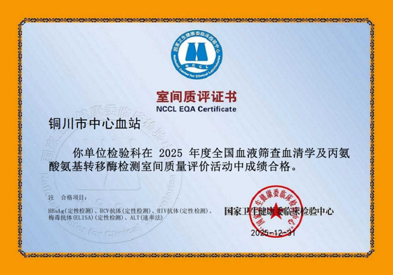 近日,国家卫生健康委临检中心发布了2025年度全国室间质量评价合格证书,铜川市中心血站在血液筛查血清学及丙氨酸氨基转移酶项目、血型项目、血液筛查核酸项目中以全部满分通过测评。该成绩表明了铜川市中心血站血液检测能力已达到国家要求,检测结果准确可信,血液质量有保障。