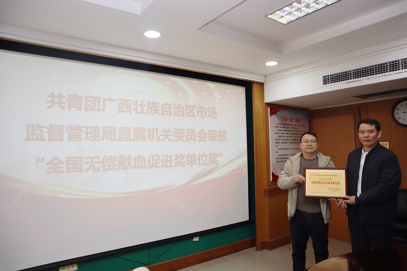 南宁中心血站党委书记、站长苏常山(左)向广西壮族自治区市场监督管理局送上全国无偿献血促进奖单位奖牌匾
