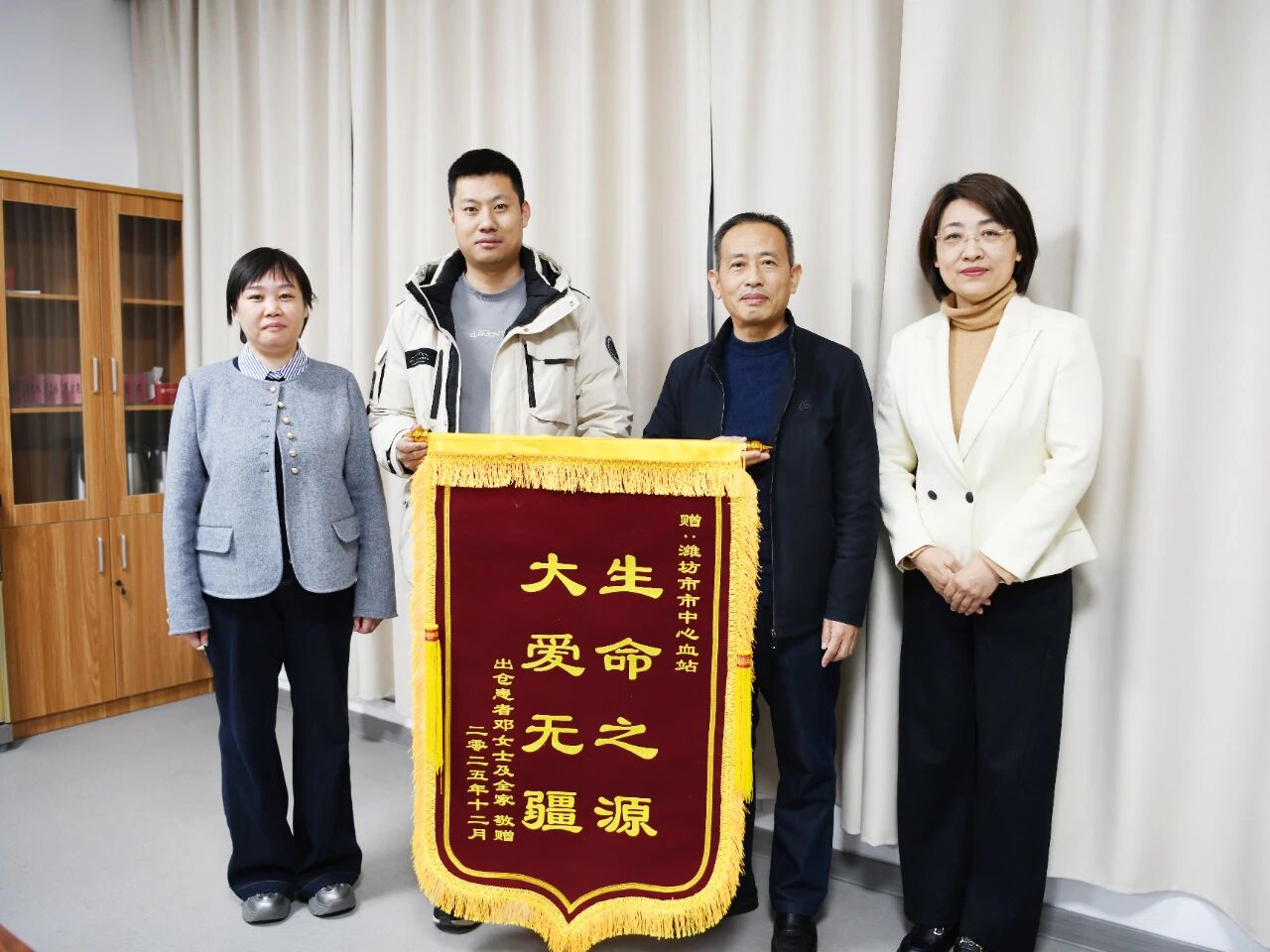 近日,潍坊市人民医院血液病医学中心医生邱志远,将患者邓女士家属赠送的一面印有“生命之源,大爱无疆”的锦旗,送到了潍坊市中心血站,以此致谢潍坊市中心血站工作人员在邓女士救治过程中的全力相助。