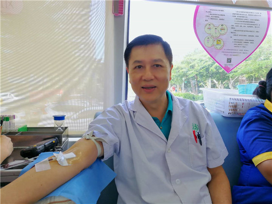 当天,海南省中医院副院长郑南生走上献血车,为捐献热血的医务人员献花,感谢他们的爱心之举并呼吁更多的职工们积极地参与无偿献血。