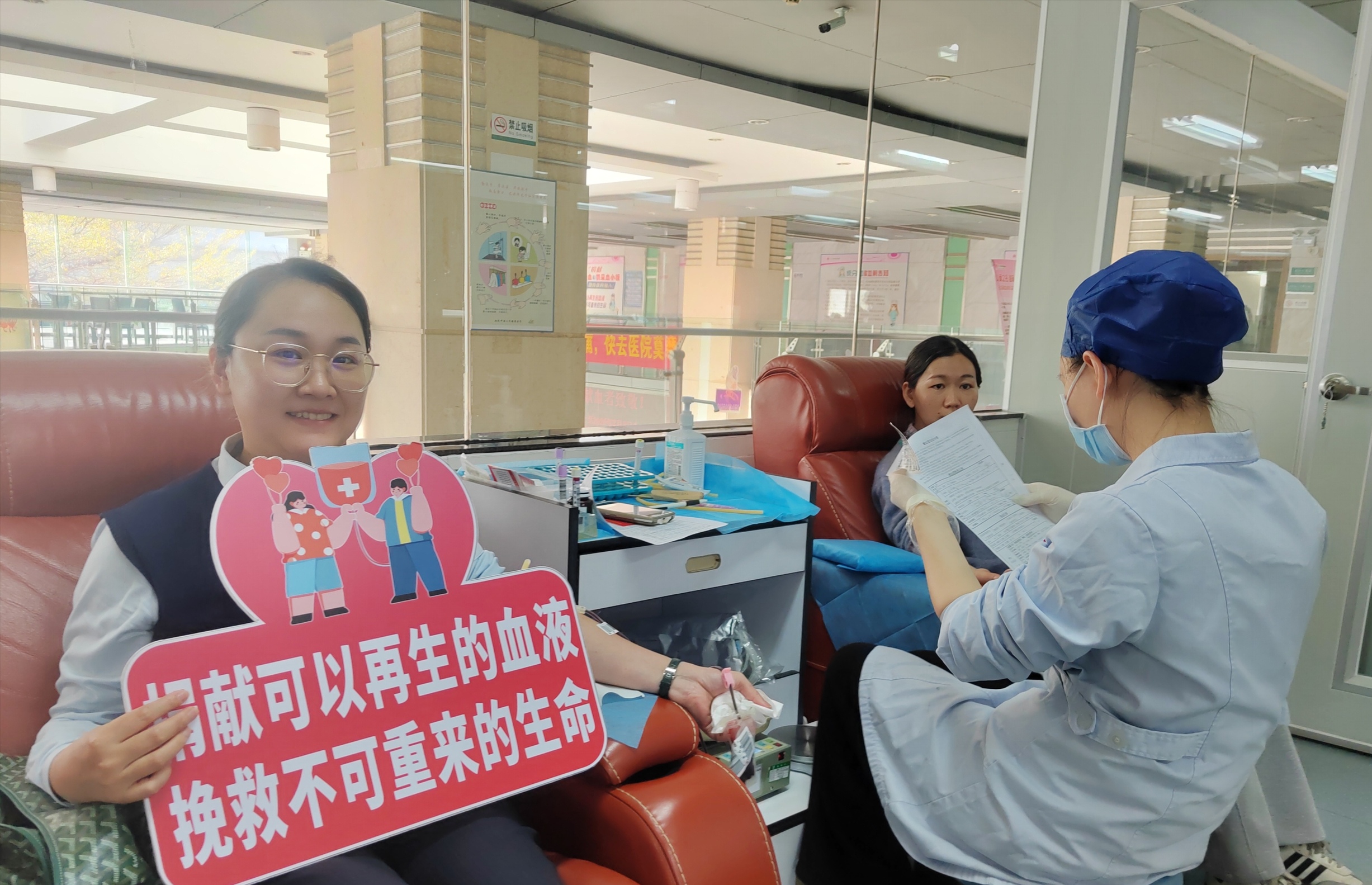 在整洁明亮的献血屋内,鲜红的“献血,从我做起”标语格外醒目。健康征询区,医护人员耐心细致地为每一位献血者讲解注意事项,用专业知识消除顾虑;采血台前,白衣天使们专注操作、温情引导,用专业与耐心守护每一份爱心;献血者们挽袖献爱,手持“马到福来 热血相‘献’”“马年献热血 大爱马上来”的宣传牌,用可再生的血液传递不可再生的希望。