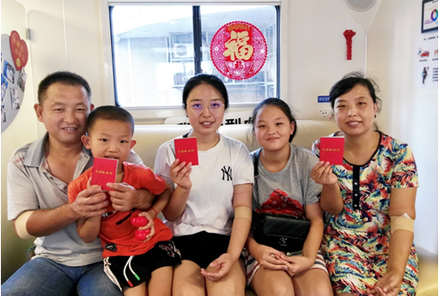 他们的大女儿余鑫萌在山西太原读大学,这次暑假回来,在陪父母献血的同时,自己也参与了第一次献血。她说:"父母是朴实的农民,他们都能接受新鲜事物和观念,我做为一名大学生,还有什么理由不献呢?我虽然是第一次献血,但我一点都不紧张,因为我能帮助到需要用血的人。"这时父亲余高锋也在旁边打气说:"没有问题,女儿最棒!"余高锋的眼神是对女儿满满的爱和期许。他的善举带动了一家人,这就是爱的力量!