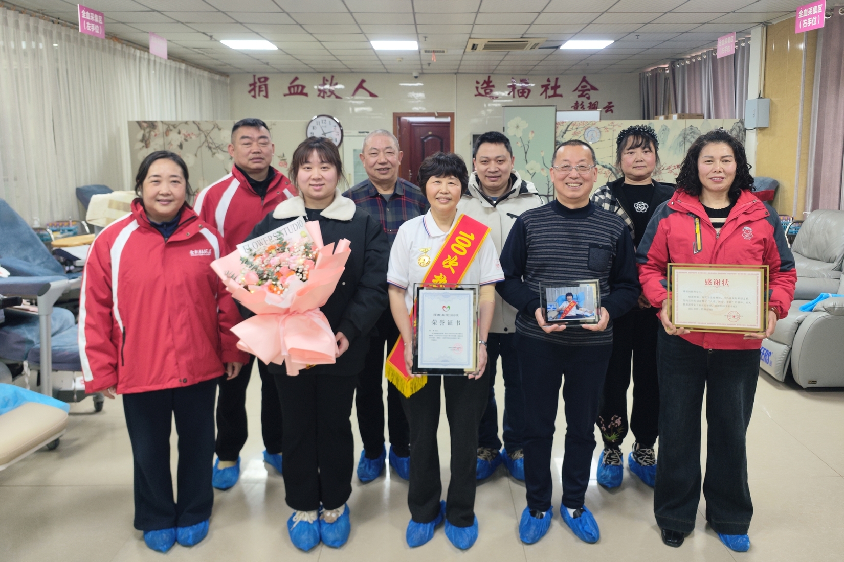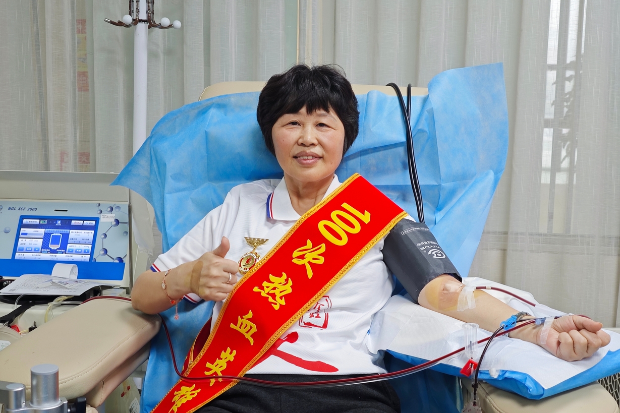 2026年2月14日上午,南充市红十字中心血站暖意融融。金彩虹巾帼志愿服务队副队长杨萼身披“100次献血英雄”绶带,在志愿者们的见证下,成功捐献1治疗量血小板,完成人生第100次无偿献血。