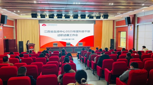 2026年2月13日,江西省血液中心举行2025年度科级干部述职述廉会议。党委书记、副主任萧锘主持会议。党委副书记、主任范为民作点评讲话。中心领导徐思平、黄会青、吴芬出席,中心干部职工60余人参加会议。