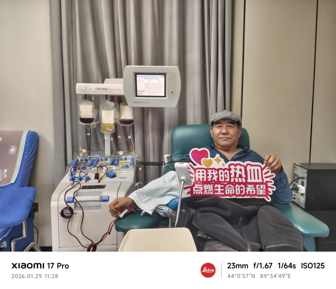 得知情况紧急,他立刻说:“我就在旁边小区,离得很近,现在就过去。”顾不上喝一口热奶茶,裹上大衣就匆匆赶往奇台分站。这已经是努尔巴特·那苏哈第4次献血,却是他第一次捐献血小板。面对陌生的采集设备,他黝黑的脸上带着一丝憨厚的紧张,但护士一提到病人急需要血小板救命,他立刻坐直了身子,攥紧了拳头说:“只要能救人,咋弄都行!”近一个小时的采集过程里,他始终保持着端正的坐姿,生怕一动就影响机器运转。当看到自己的血小板被缓缓收入血袋时,他粗糙的手掌轻轻贴在透明袋壁上,仿佛能感受到另一端生命的脉动。