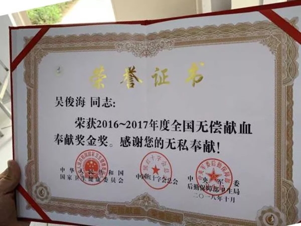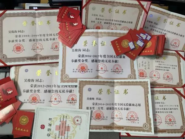 “这本荣誉证书是我上个月刚领到的,是第三本无偿献血金奖,拿到这个证书我真的心情很激动,也感到非常光荣....”。见到吴俊海时,他正在整理自己献血16年来荣获的40多本荣誉证书。这些证书是对他16年来118次无偿献血的见证。也完美诠释了爱的奉献和真善美的传递。