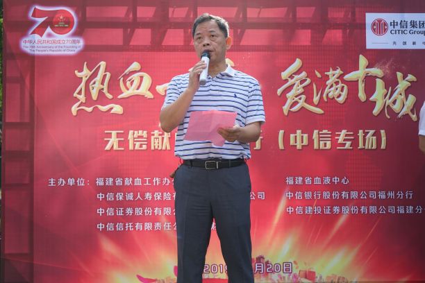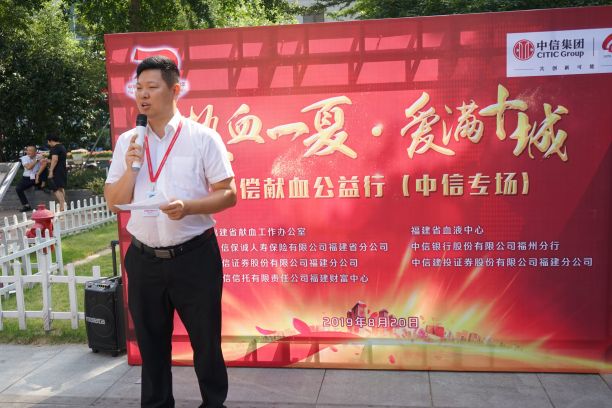 为贯彻习近平总书记关于健康中国建设的重要指示精神,推进"健康福建"的战略实施,8月20日上午,在新中国成立70周年之际,福建省献血工作办公室、福建省血液中心联合中信集团下的五家企业——中信保诚人寿保险有限公司福建省分公司、中信银行股份有限公司福州分行、中信证券股份有限公司福建分公司、中信建投证券股份有限公司福建分公司、中信信托有限公司福建财富中心,共同开展了“热血一夏·爱满十城”无偿献血公益行活动。