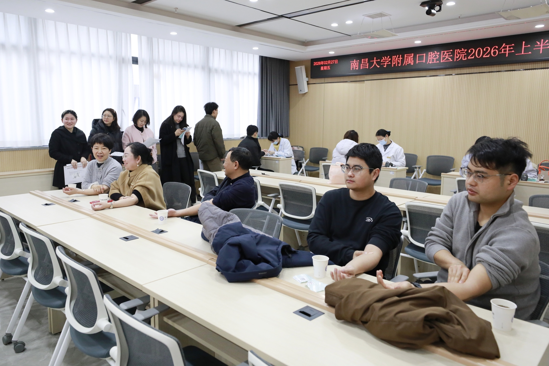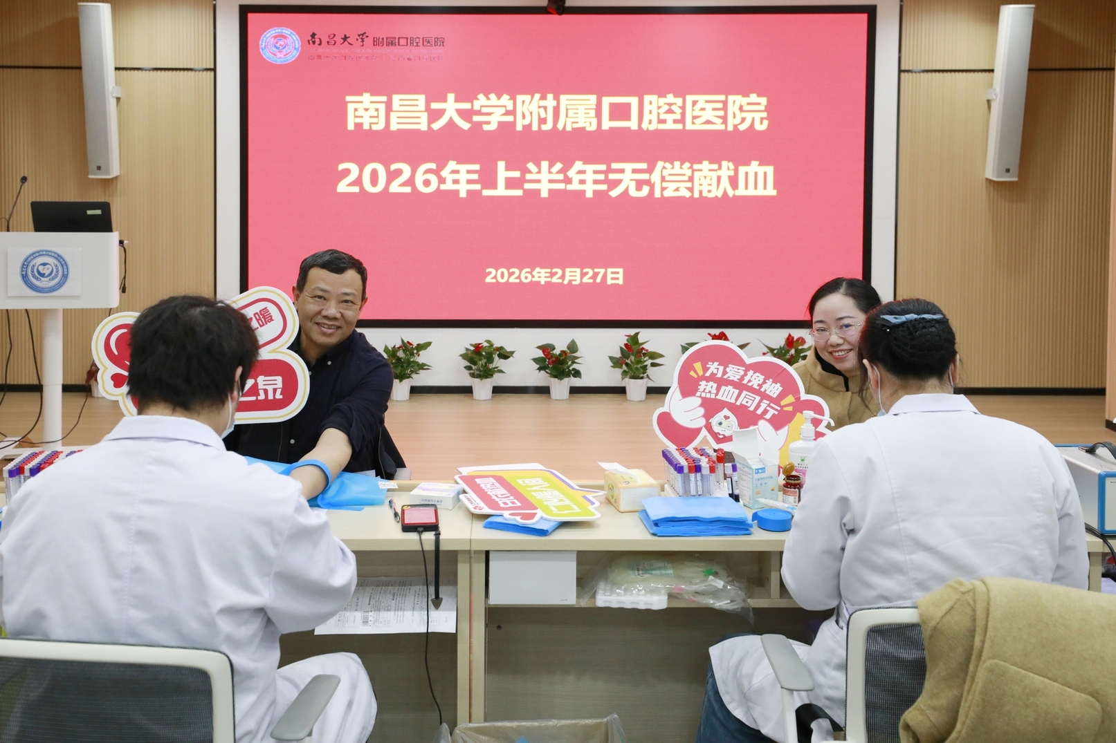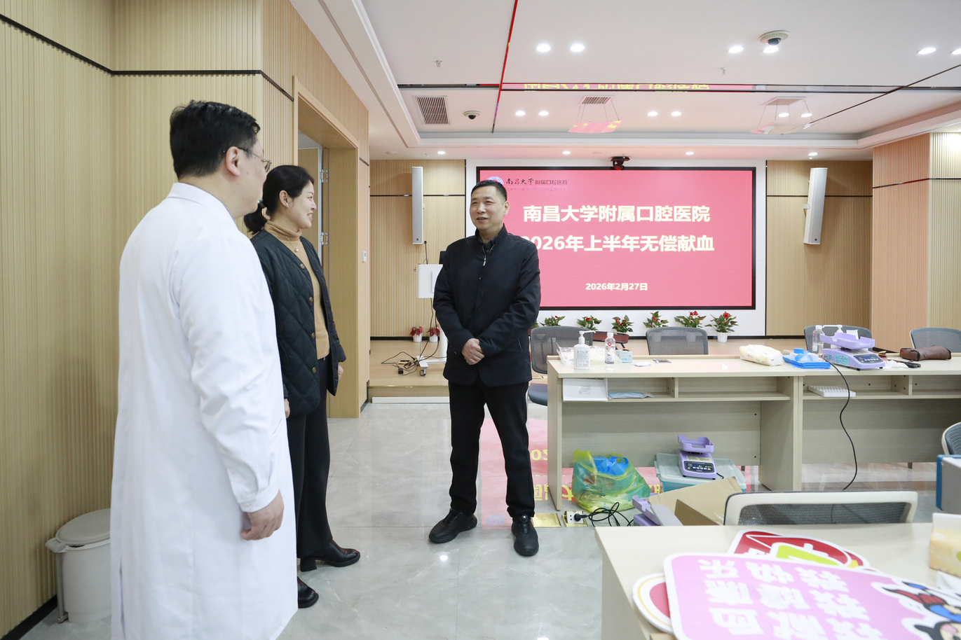 寒随冬去,春携雨来。为全面保障春季临床用血需求,2月27日上午,南昌大学附属口腔医院组织开展了2026年上半年无偿献血活动,本次献血活动以党支部为单位,党员干部率先垂范,充分发挥先锋模范作用,全院职工积极响应,58名员工成功献出爱心血液达13800毫升,为春天的寒意注入暖流。院纪委书记乐晟霁、省血液中心副主任徐思平到现场看望慰问参与献血的人员。