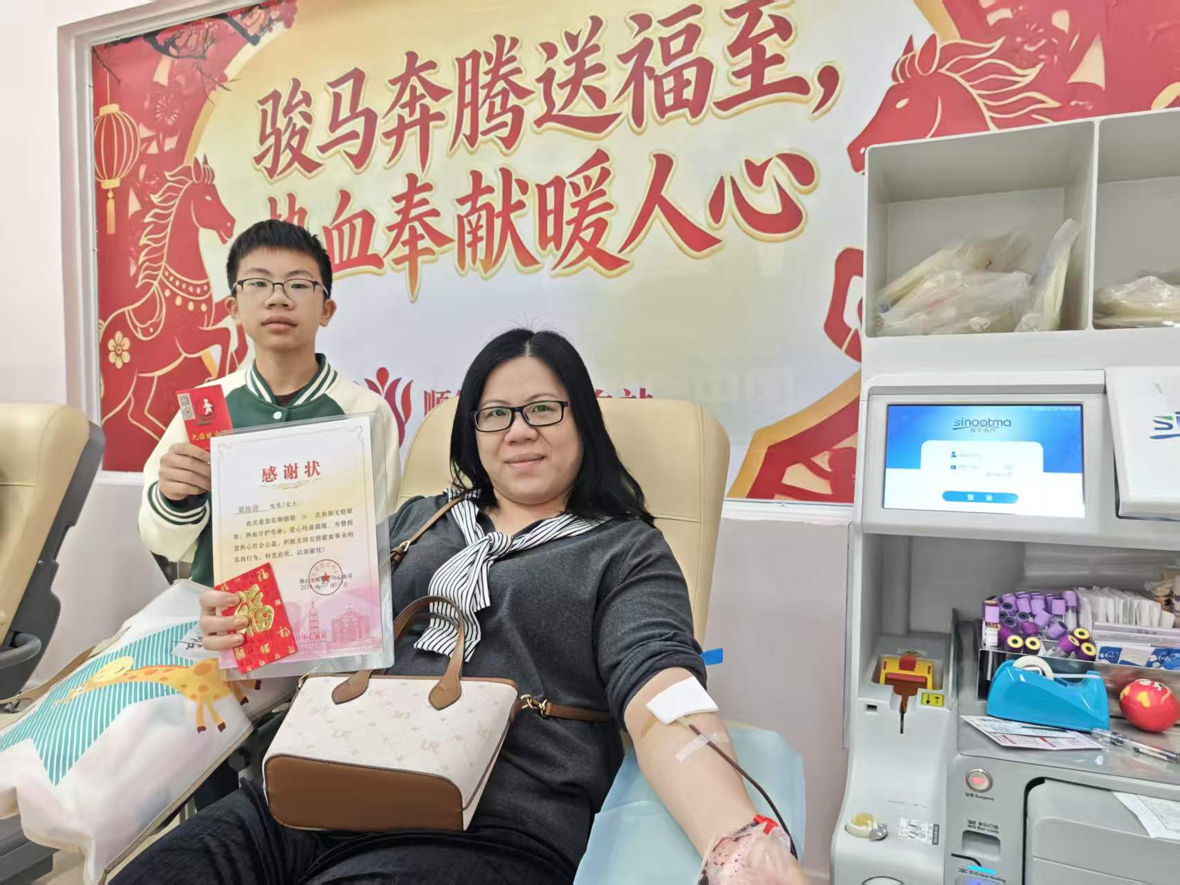 当天,共有49人成功献血,其中全血献血者28人,累计献血9800毫升;单采血小板献血者21人,共35个治疗量。马年新春,顺德市民以一臂之力传递温情年味,用点滴热血守护生命希望,让这份承载着健康与祝福的善行,在千家万户代代传承,让爱心之花在凤城大地绚烂绽放。