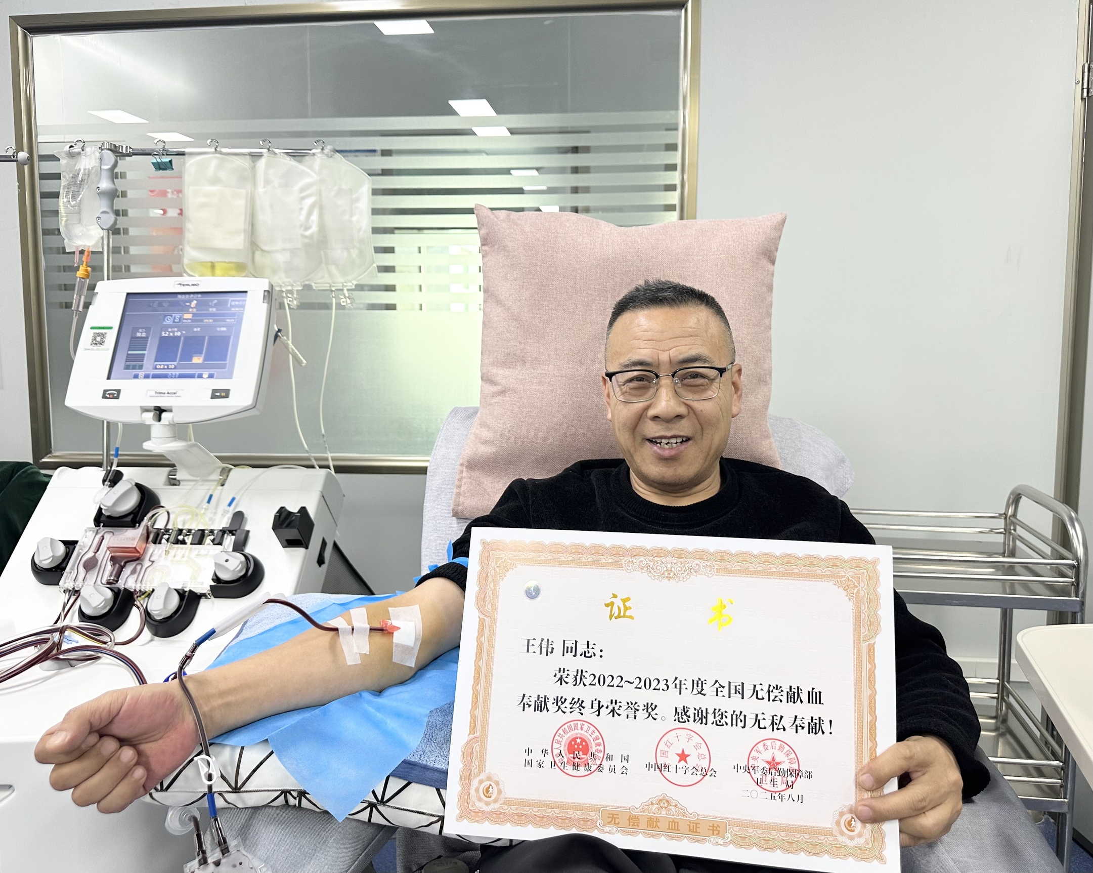 在这里,我们见到了“2022-2023年度全国无偿献血奉献奖终身荣誉奖”的王伟。手捧荣誉证书,他没有停步,而是再次伸出手臂,用行动诠释奉献的初心。