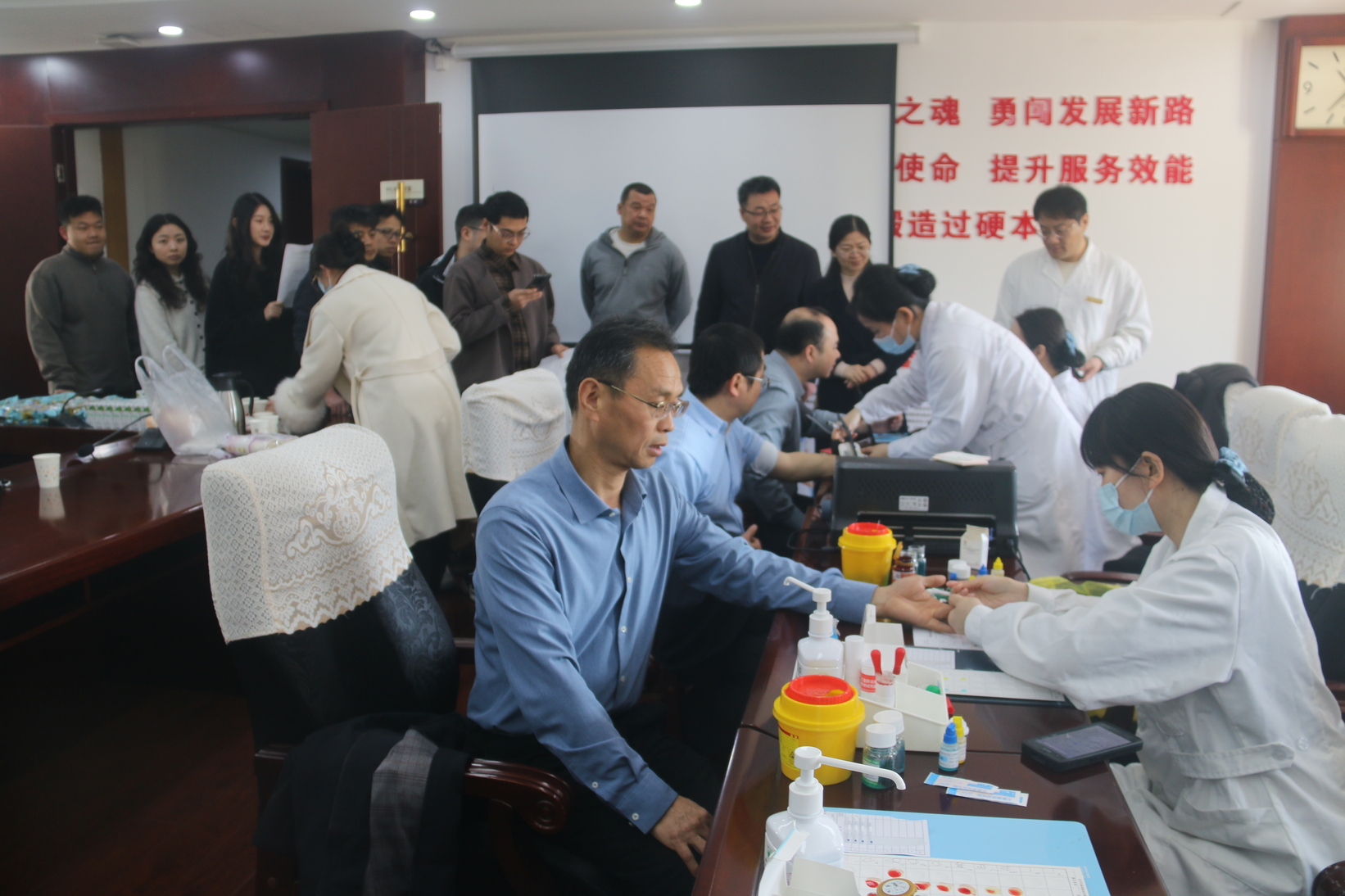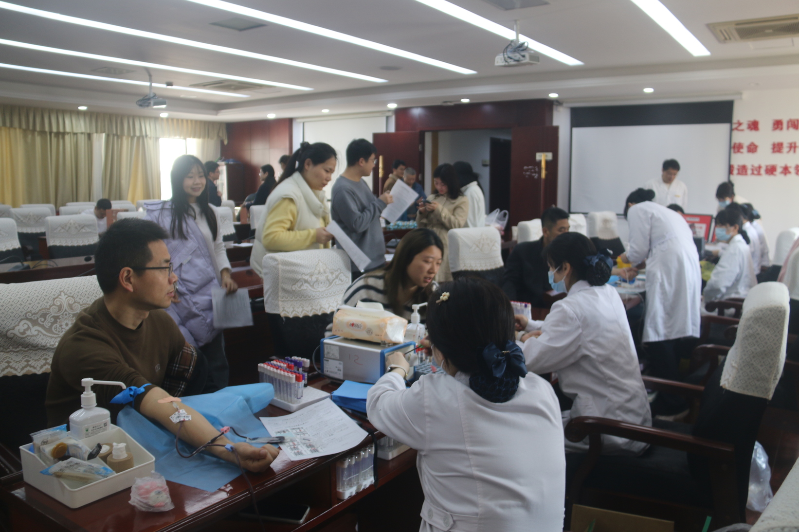 早上9点不到,西301会议室内就有序排起了长队,大家严格按照献血流程进行献血登记、测量血压、采血化验、确认合格后有序献血。有许多处室领导刚开完会便匆匆赶来献血,稍作休息后又返回工作岗位……一个个带着体温的血袋,一张张光荣的献血证,凝聚着省卫健委人的责任和担当,大家用实际行动诠释大爱无疆,传承雷锋精神。