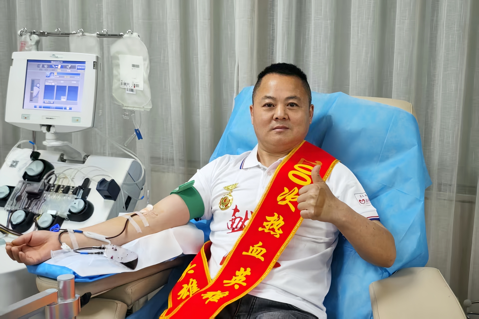 当天,杜茂姣身披红色绶带,面带微笑坐上献血椅,顺利捐献2治疗单位血小板。至此,他累计献血量达74900毫升,相当于自身18倍血量。