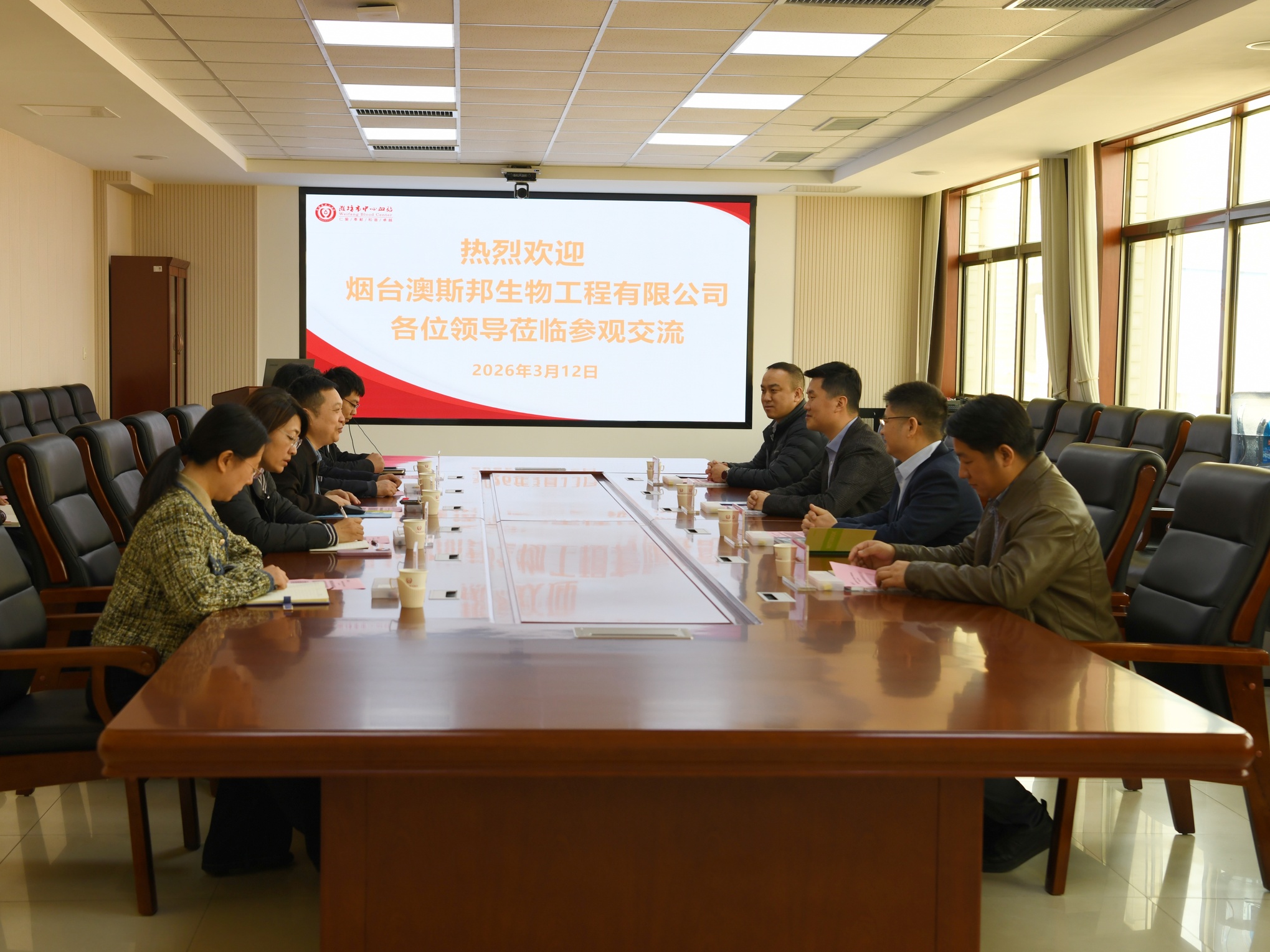 近日,烟台澳斯邦生物工程有限公司总裁王湃一行四人莅临潍坊市中心血站参观交流,市中心血站党委书记、站长王胜陪同。