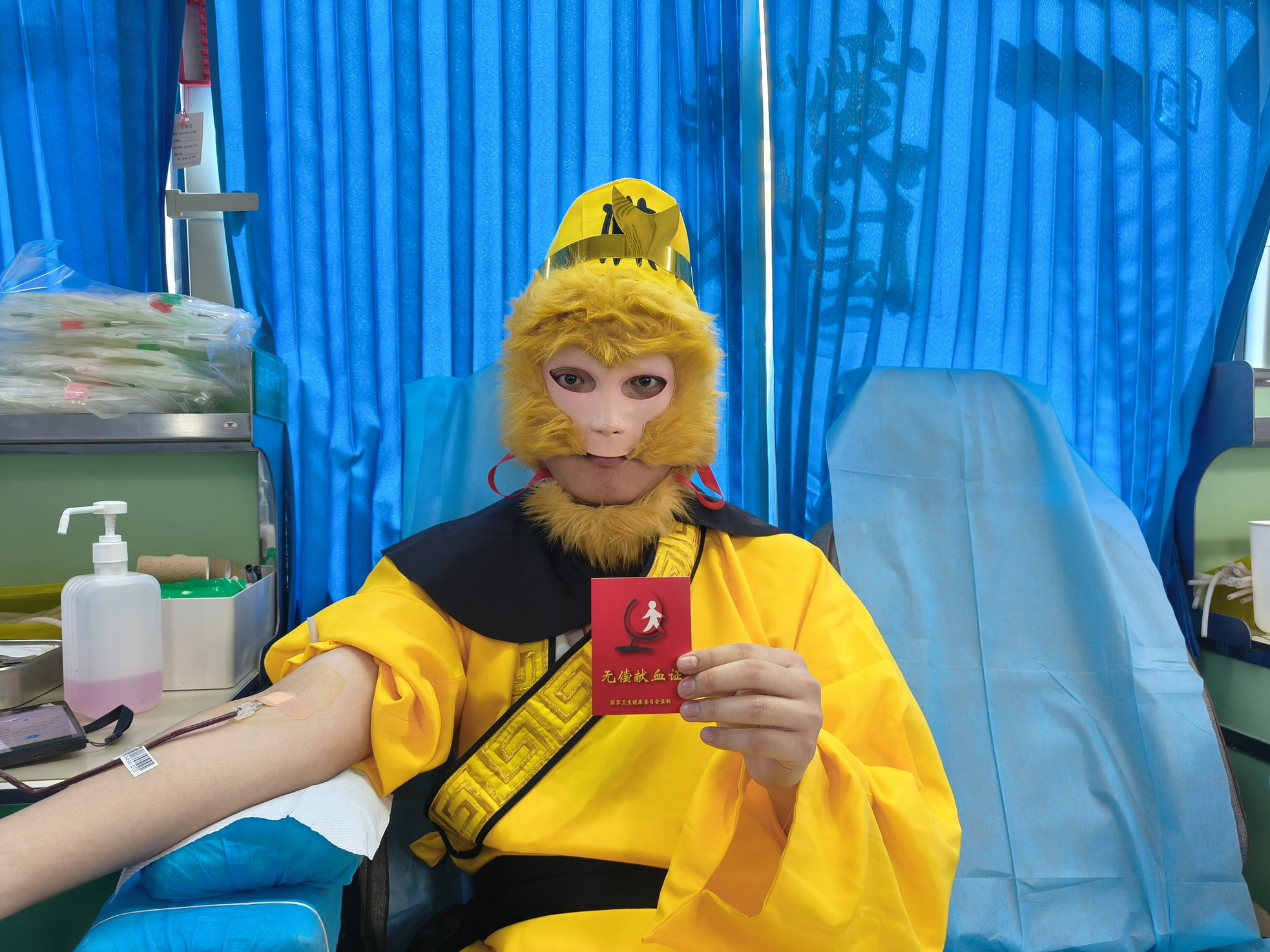 3月23日下午,在日照航海工程职业学院,20岁的赵宇泽带着心中的英雄梦,在室友陪伴下,完成了人生第一次无偿献血——这一次,他化身自己的“齐天大圣”,以热血为棒,以善意为甲,喊出最青春的担当:无偿献血,俺老孙来也!