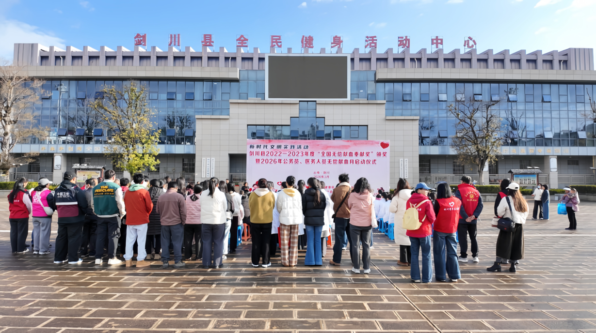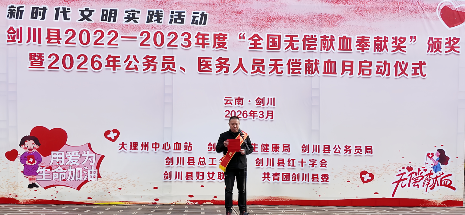 为弘扬无私奉献精神,激励更多人投身无偿献血事业,同时推动医务人员和公务员群体发挥带头示范作用,3月18日,由大理州中心血站,剑川县卫生健康局,剑川县公务员局,剑川县总工会,剑川县红十字会,剑川县妇女联合会,共青团剑川县委共同举办的2022-2023年度“全国无偿献血奉献奖”颁奖暨2026年公务员、医务人员无偿献血月启动仪式,在剑川县阿鹏广场隆重举行。