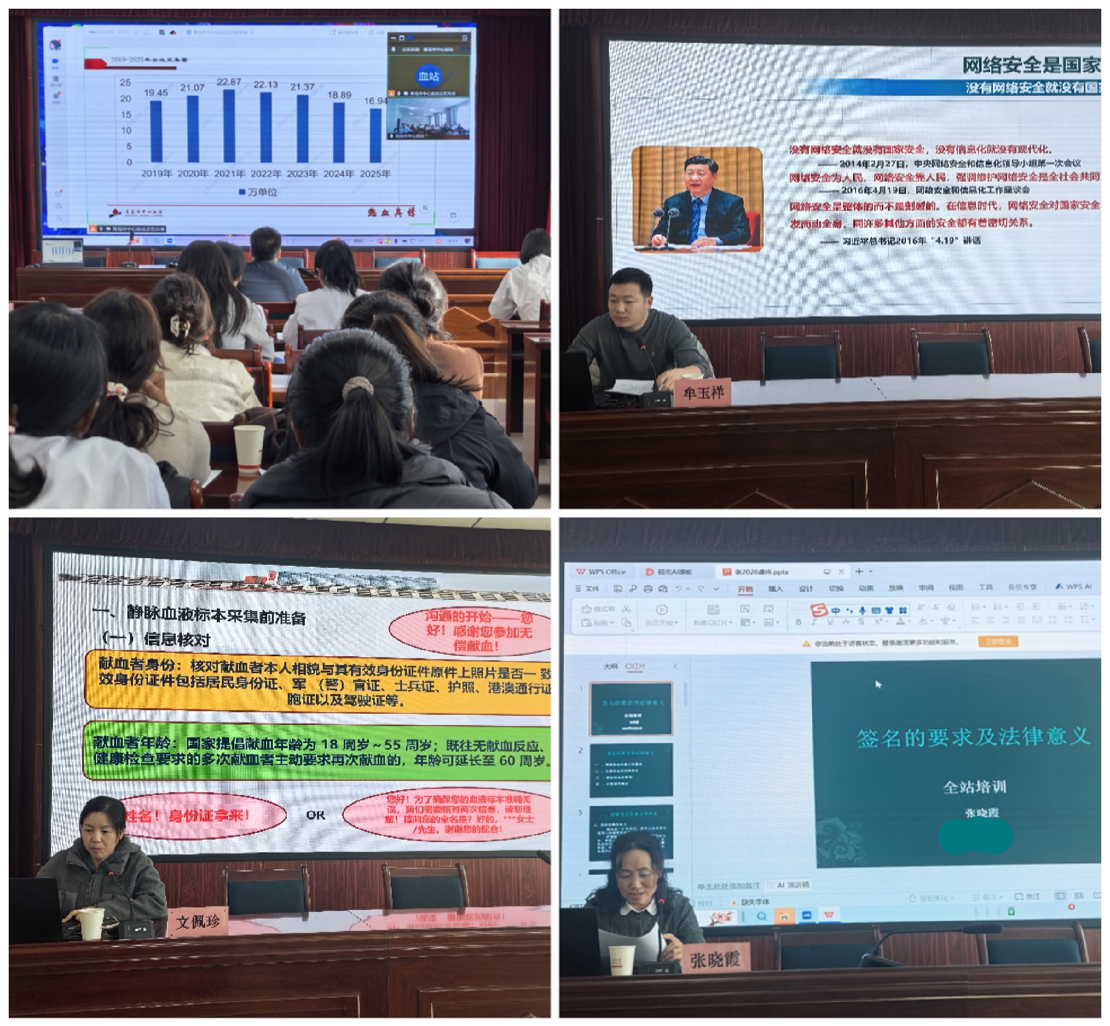 此次培训紧扣采供血工作实际需求,邀请了青岛市中心血站社会服务部主任单晓丽、市卫健委规划信息科牟玉祥、长春中医药大学附属医院定西医院静脉治疗小组组长文佩珍及血站主任护师张晓霞同志,通过现场及线上授课的方式就《献血者招募与保留实践分享》、《共筑网络信息安全》、《血液标本采集指南解读》和《签名的要求及法律意义》进行了培训。