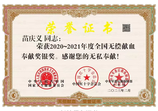 情系第二故乡,热血奉献社会。苗庆义无偿献血时长21年,20次献血7800毫升,荣获了2022-2023年度全国无偿献血奉献奖银奖。