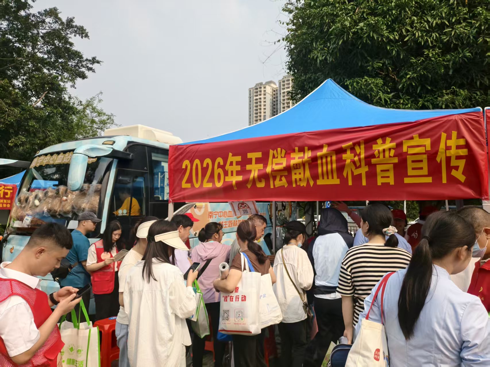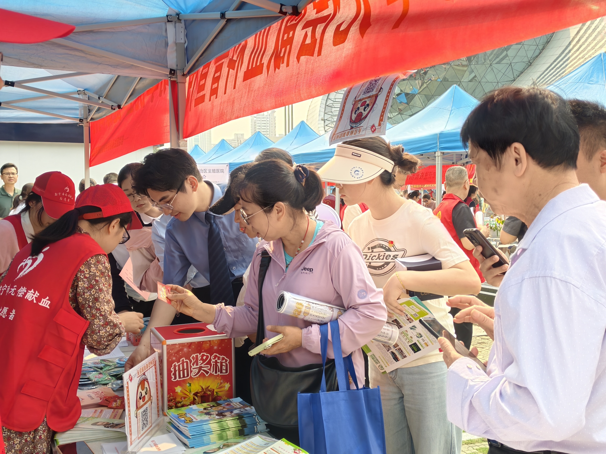 作为活动的一大亮点,南宁中心血站现场安排了采血车,同步开展无偿献血活动。在党员志愿者的引导下,不少符合条件的市民登上采血车,撸起袖子献出自己的一份热血。一袋袋温热的血液,承载着捐献者的爱心与希望,汇聚成守护生命的强大力量。