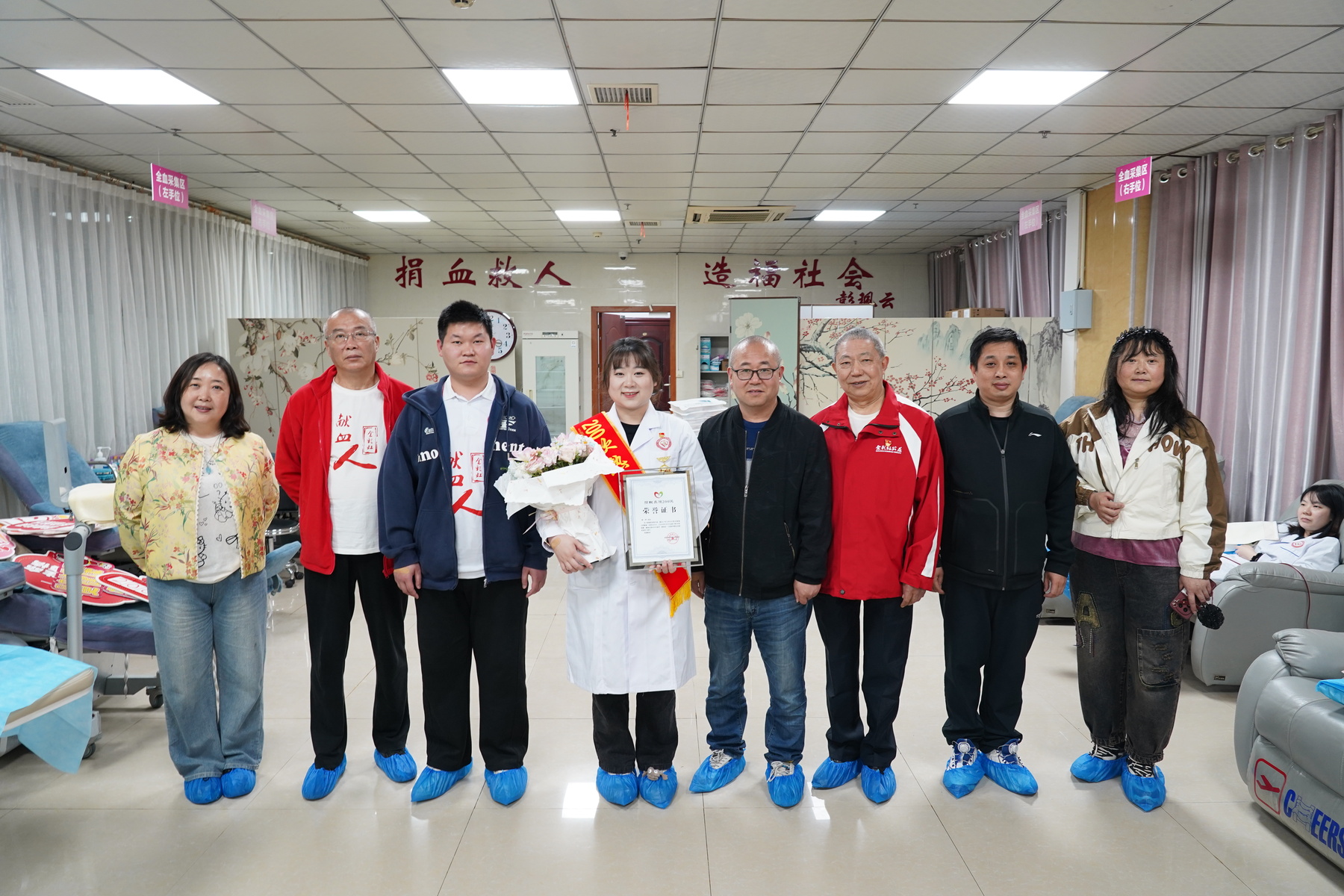 金彩虹协会邓勇副会长为金昕颁发了荣誉证书和专属勋章。更感人的是,血站尹黎、程欣、杨丹等3名职工,邓勇、张淼、何艳、金高明、王志伟、李小新、张一鸣等7名金彩虹志愿者纷纷挽袖,以集体献血的方式“陪跑”金昕,将现场的奉献热情推向高潮。