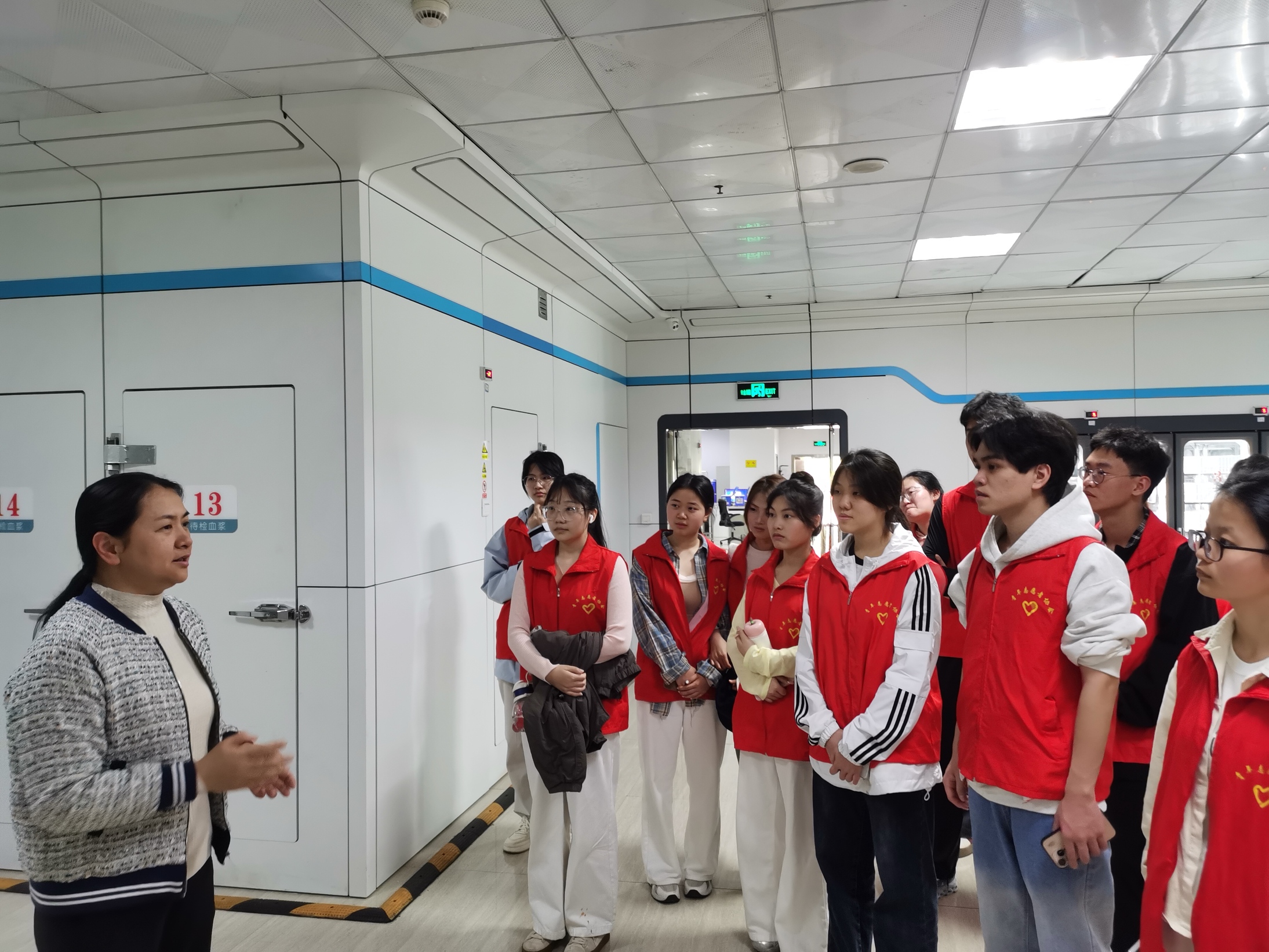 随后,师生们有序走进血液科普馆、采血大厅、成分制备科、检验科、供血科等核心工作区域,实地探访“一袋血的生命旅程”。在采血大厅,同学们观摩了医护人员规范的采血流程,看到献血者们从容奉献的身影,纷纷心生敬意;在成分制备科,大家了解到采集后的全血需经过离心、分离、提纯等多道工序,制成红细胞、血浆、血小板等不同成分,实现血液资源的精准高效利用;在检验科,先进的检测设备、严谨的检测流程,让同学们深知每一袋血液都要经过严格筛查,才能确保临床用血的绝对安全;在供血科恒温恒湿的储血库中,一排排整齐摆放的血液制品,如同守护生命的“生命宝库”,深深震撼着每一位师生。