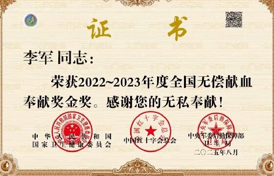 热血不息,大爱不止。二十余载风雨兼程,初心始终滚烫不变。往后岁月里,李军表示会一直坚守无偿献血之路,一如既往伸出手臂、捐献热血,保持热爱与热忱不动摇。他愿以蝼蚁微光汇聚人间暖意,以平凡之力传递向善大爱,用自己最简单纯粹的方式守护每一个珍贵生命,以点滴善行温暖一方土地,让奉献之爱久久传递,用实际行动彰显党员本色,续写无偿献血的温暖篇章。