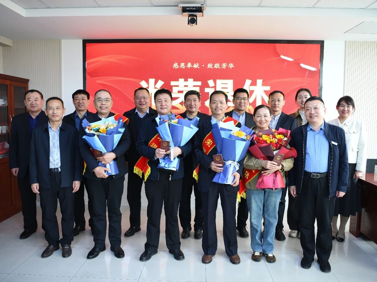 致辞环节结束后,王胜站长为四位荣退职工代表颁发退休证、送上鲜花,现场温情洋溢、掌声不断。