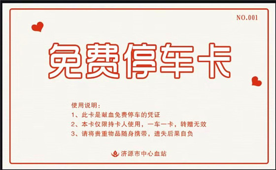 记者了解到,信尧购物广场献血点和建业步行街献血点位于我市商业区繁华路段,每逢周末、节假日,前来献血的爱心市民经常会面临“停车难、没有合适的停车位”的问题。“为了让前来献血的市民安心停车,我们与周边两家停车场进行了多次沟通,最终达成了合作,让爱心市民轻轻松松停车。”济源中心血站有关负责人介绍,自9月1日起,开车到信尧购物广场献血点、建业步行街献血点献血的市民可以领取一张爱心停车卡,即可免费停车。