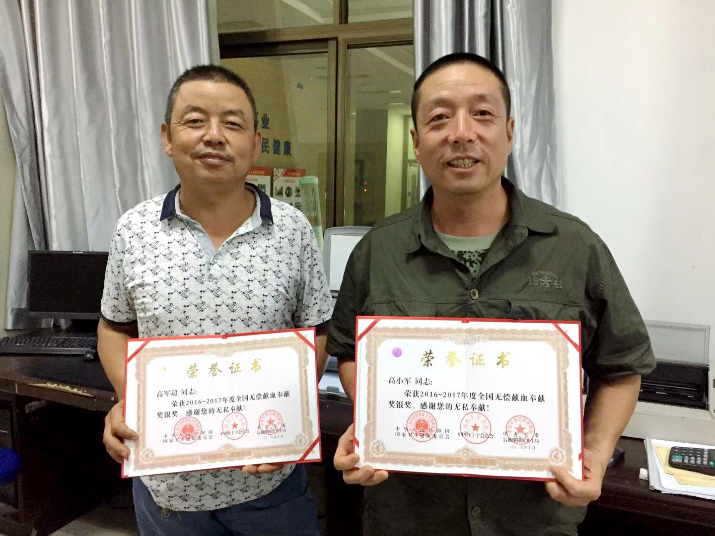 8月26日,天空飘着小雨。下午3时左右,位于宝鸡市中心血站一楼的市献血办服务窗口来了两名身高、穿着、肤色很相近的中年男子,他俩一起从事建筑工作已有很多年,这天因为下雨,工地停工休息,他们才抽出时间相约来领取2016-2017年全国无偿献血奉献奖。