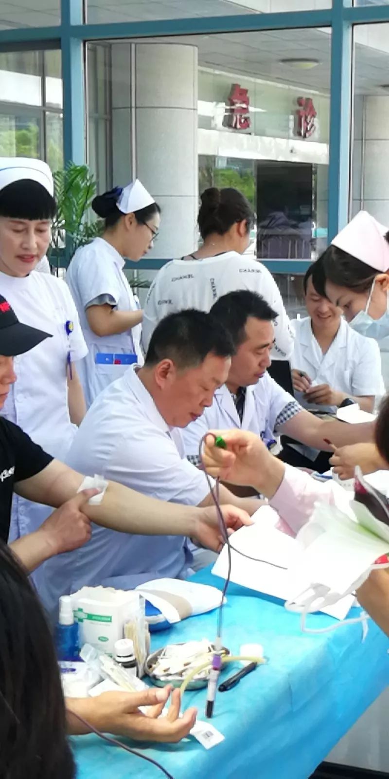 在医院门诊大厅组织开展了无偿献血活动。
