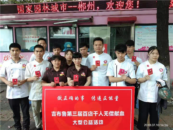 通讯员(李智宏 胡林丽)近日,郴州吉布鲁自助餐厅应四川总公司倡议,开展第四届“百店千人”无偿献血活动,当天共有7人伸出手臂、奉献爱心。