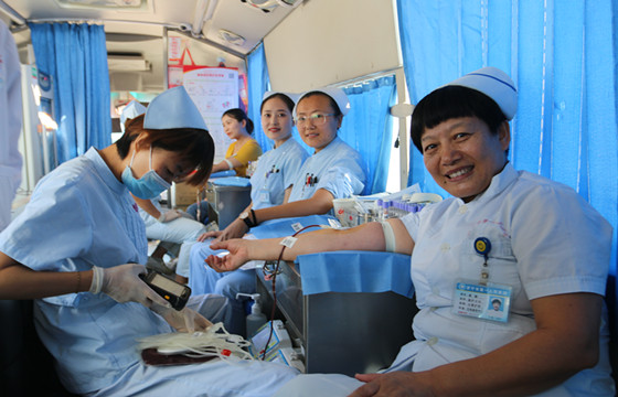 23日上午,献血车刚到医院,儿科的副护士长郭瑞就与同事们一起来到献血车上,伸出手臂奉献热血。年轻护士王芳芳虽然是第一次献血,但她积极要求献400毫升。急诊科的王丽今天上夜班,为了献血专门从家中赶到医院,并且询问献血车停留的时间,想让家人也参加这个奉献爱心的活动。献血车停在住院服务部的前面,副护士长唐娜积极帮忙解决用电问题,每次都带领科室的年轻人奉献热血。她说:“救死扶伤是我们医护人员的天职,献血是奉献爱心的一种表现,也是一项爱心接力,抽空过来贡献一份力量。”输血科的孙辉与张诒勋除了带头献血之外,还在献血车上忙前忙后,一会帮献血者递水,一会又给献血者介绍献血后的注意事项。输血科是与血液接触最多的科室,他们默默无闻地为用血者服务,并协助血站宣传献血知识,为输血事业做出了巨大贡献。